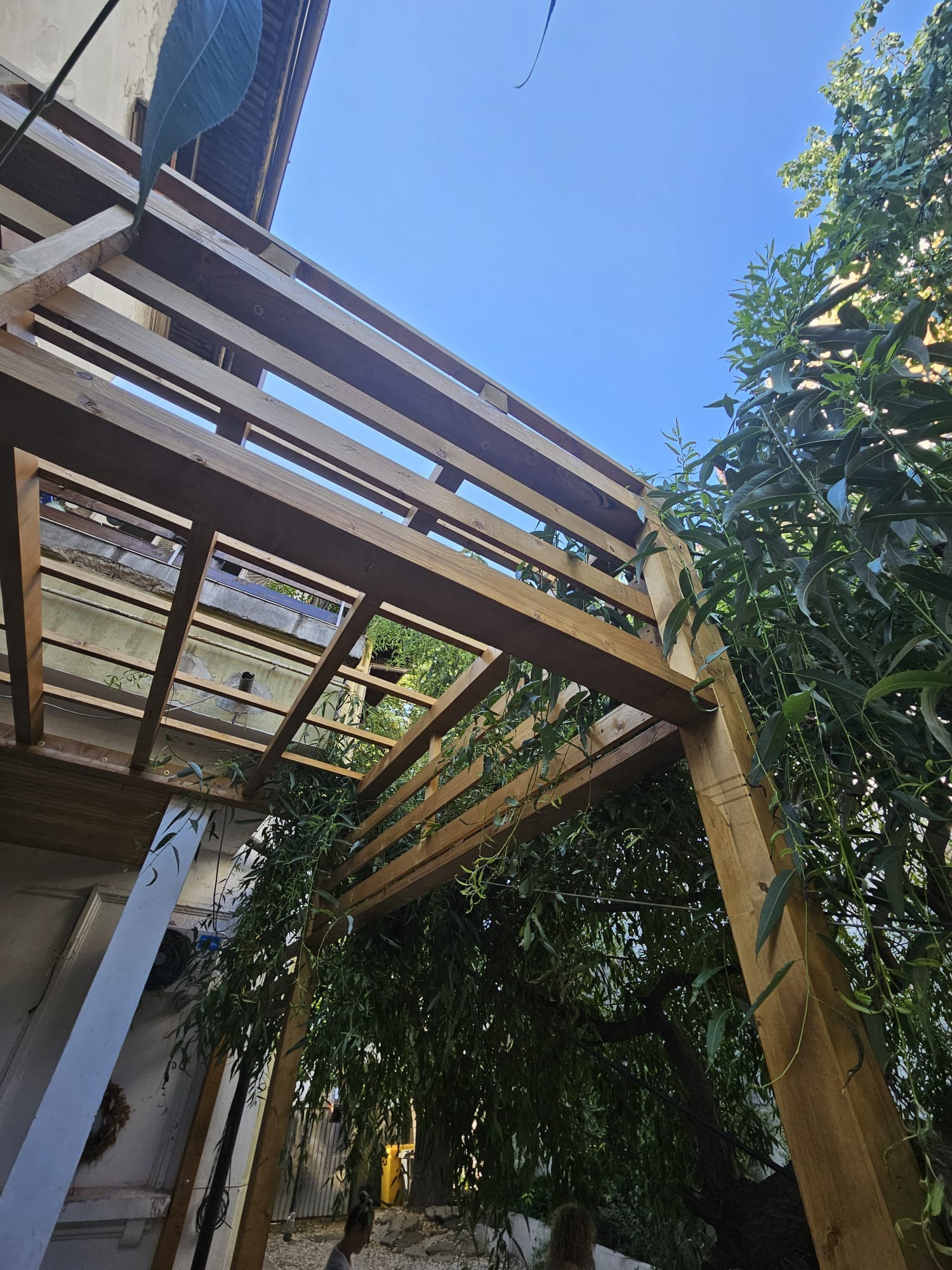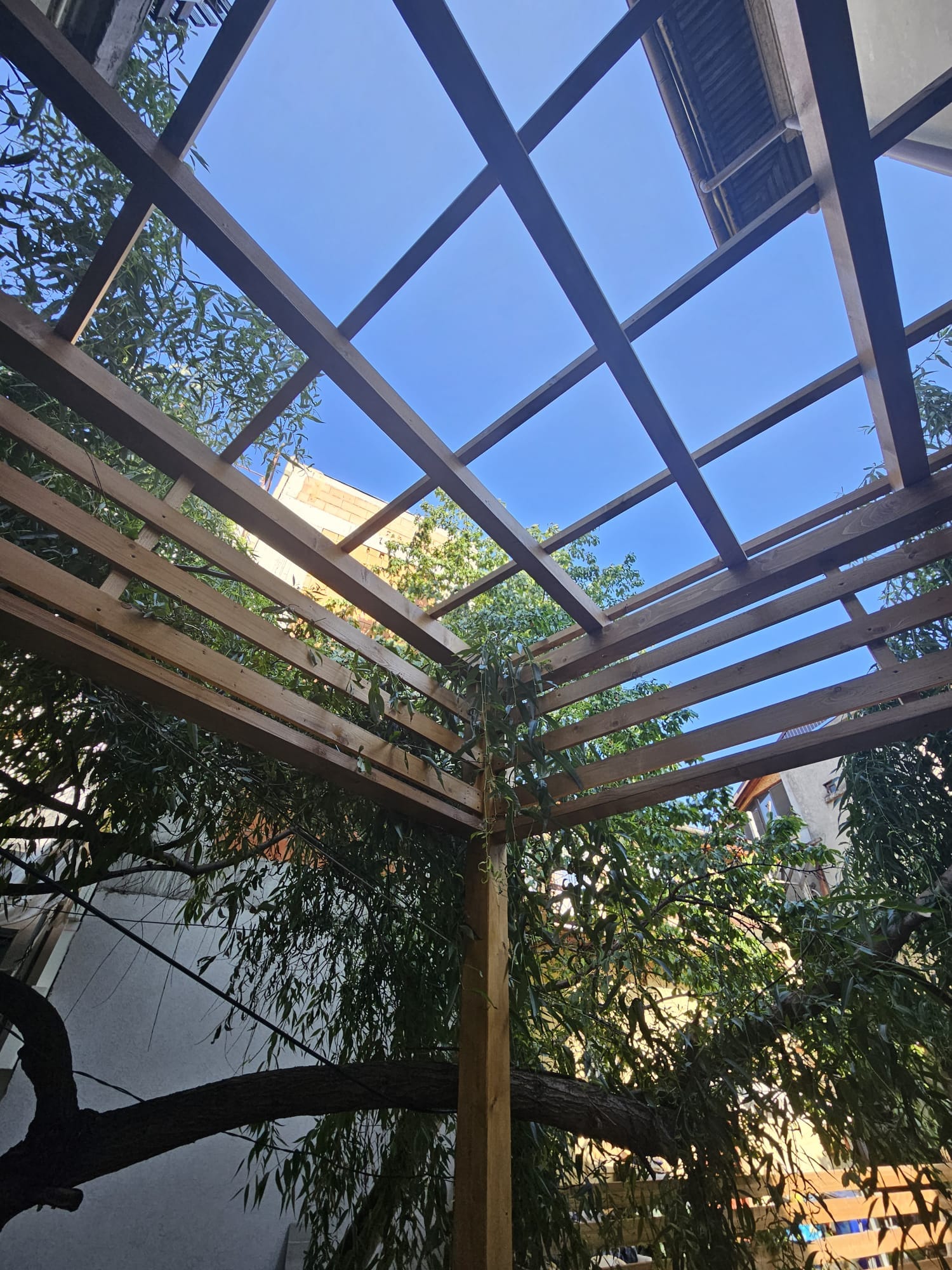 Provocarea proiectului a fost modalitatea de integrare a casei si vegetatiei cu noua pergola si inaltimea acesteia de aproape 4 metri.